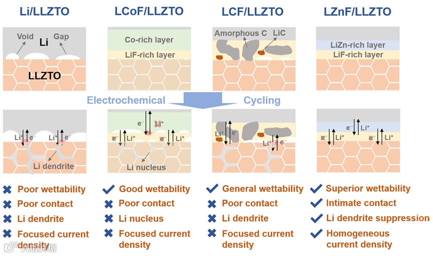图4. 纯锂或复合阳极(LCoF、LCF和LZnF)/LLZTO界面的演变示意图。