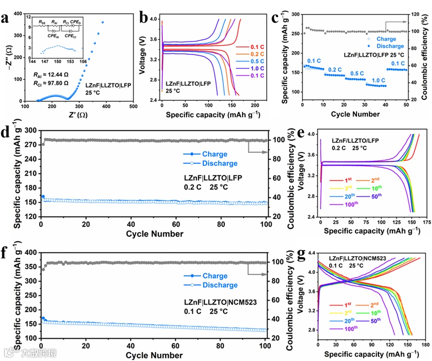 得益于LZnF/LLZTO界面的离子/电子类双层导电结构,匹配LFP正极的SSLMB表现出低的总电阻、高的放电容量、出色的倍率性能和优异的长循环性能(在0.2 C的电流下稳定循环100圈后容量保持率为95%)。同时,匹配NCM523正极的SSLMB的循环性能(在0.1 C的电流下稳定循环100圈后容量保持率为81%)也十分优异(图5)。
