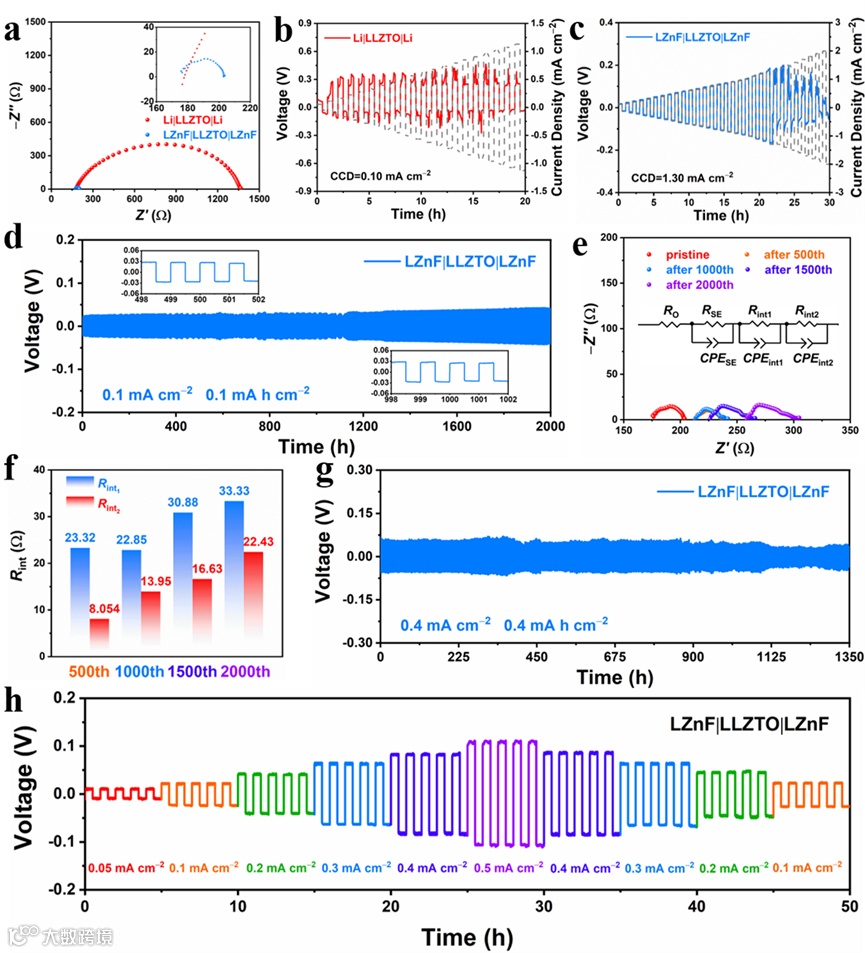 富LiF层抑制锂枝晶的形成和确保Li+的输运,富LiZn层增强界面接触和均匀锂沉积。因此,LZnF/LLZTO界面实现局部电流密度的均匀分布和Li+在界面和电极内部的高效传输,从而确保均匀的锂沉积和抑制锂枝晶的生长。相比于匹配纯Li的对称电池,匹配LZnF的对称电池表现出低的ASR(11.3 Ω cm2)、高的CCD(1.3 mA cm−2)和优异的Li沉积/剥离性能(0.1 mA cm−2循环2000 h和0.4 mA cm−2循环1350 h)(图3)。