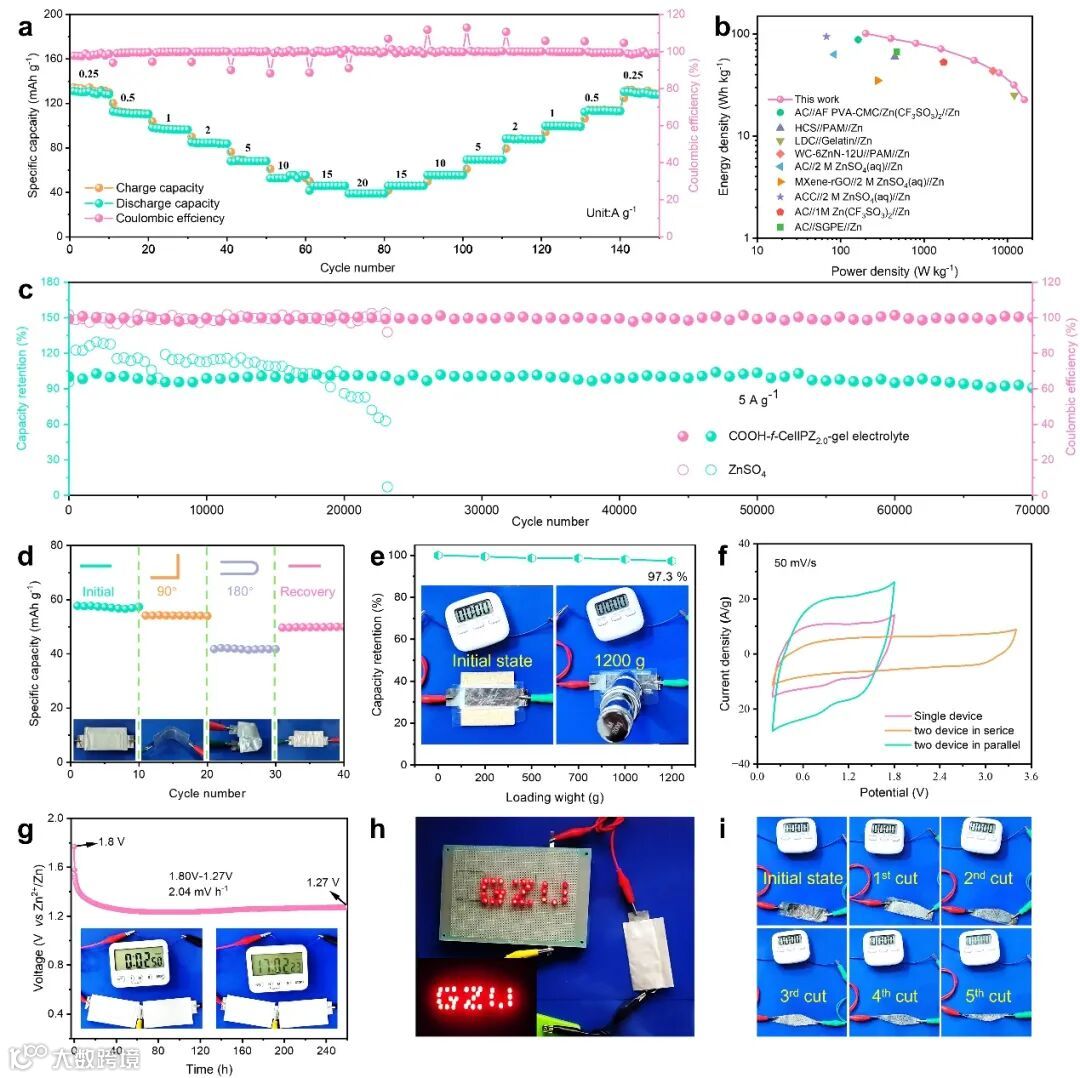 通过组装Zn||AC全电池,进一步研究COOH-f-CellPZ-gel电解质的优势。COOH-f-CellPZ-gel电解质具有优异的倍率性、高能量密度和功率密度。得益于精心的设计,COOH-f-CellPZ-gel电解质全电池能够循环7万圈,容量保持率高达91%,库伦效率为100%。这些结果有力的证实了COOH-f-CellPZ-gel电解质在保护锌阳极方面的突出优势。此外,该电解质可以在各种外力条件下正常工作,包括弯曲、压缩、锤打和大幅切割。因此,本研究工作采用可持续分子工程化策略,在构建安全、环保、柔性和低成本的纤维素基准固态水系锌离子电容器领域具有重大意义。