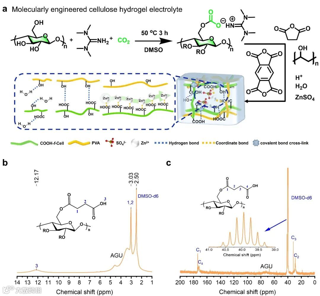 图2. 羧酸功能化纤维素的制备示意图、1H-NMR和13C-NMR。