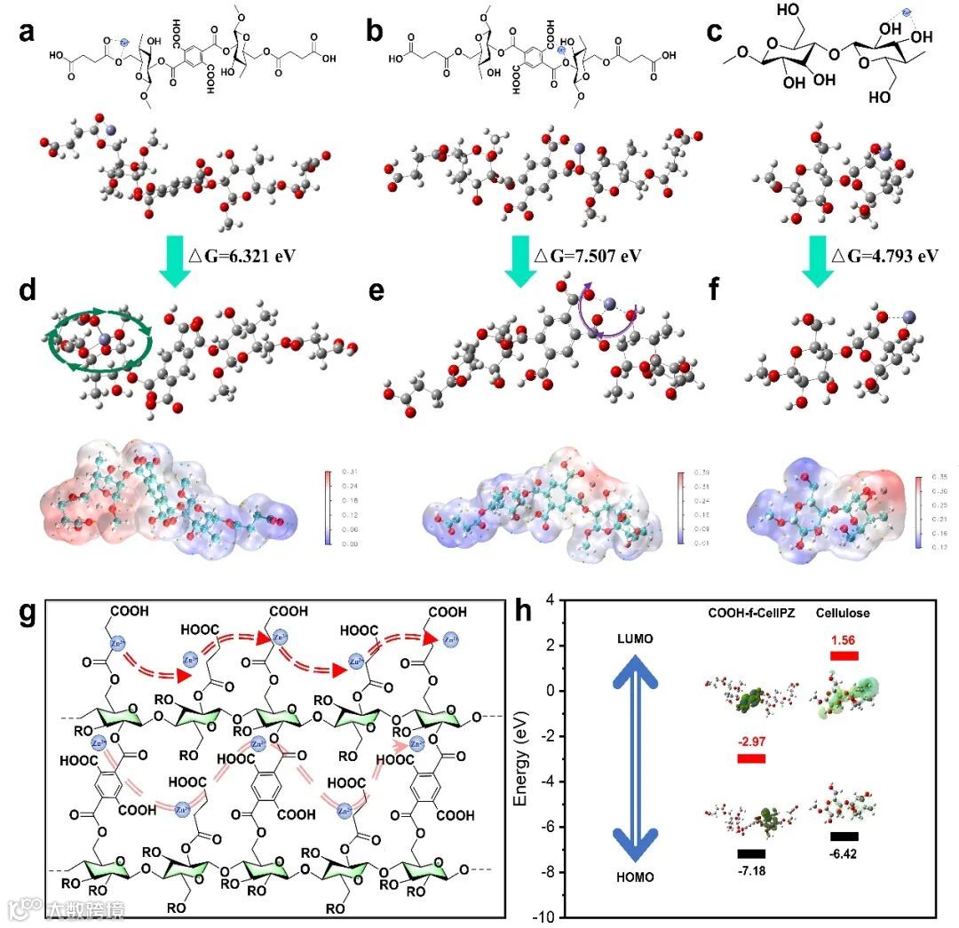 柔性SA链与刚性PMDA交联剂的引入形成了更多的低电负性区域,表明COOH-f-Cellulose上的-COO和-COOH基团易于与Zn2+相互作用。当Zn2+吸附在COOH-f-Cellulose柔性SA链上的-COO和-COC-基团上,吸附能为6.321 eV,当Zn2+与-COO、-COOH和-OH基团配位时,吸附能高达7.507 eV。这是因为柔性SA链通过链迁移来配位Zn2+。结果表明,Zn2+与COOH-f-Cellulose中的含氧官能团的吸附能明显大于纤维素。因此,在COOH-f-Cellulose中引入柔性SA链和刚性PMDA分子,不仅构建了Zn2+的通道,而且由于较大的吸附配位能,抑制了Zn2+的无序扩散,最终得到无枝晶的锌阳极。