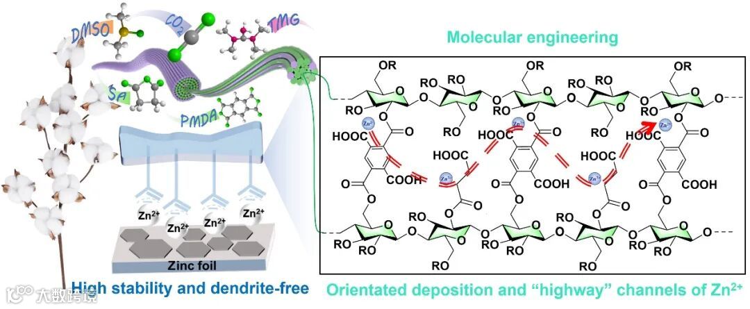 图1. 可持续分子工程化COOH-f-CellPZ-gel电解质的制备,定向沉积和无枝晶的锌阳极。