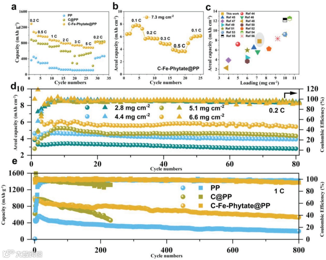 图4. 电化学性能。(a)PP电池,C@PP电池和C-Fe-Phytate@PP电池的倍率性能。(b)C-Fe-Phytate@PP电池在高硫负载下的倍率性能。(c)C-Fe-Phytate@PP电池与报导文献的电化学性能对比。(d)C-Fe-Phytate@PP电池在硫负载分别为2.8, 4.4, 5.1,6,6 mg cm-2的循环测试。(e)PP电池,C@PP电池和C-Fe-Phytate@PP电池在1 C电流密度下的循环性能测试。