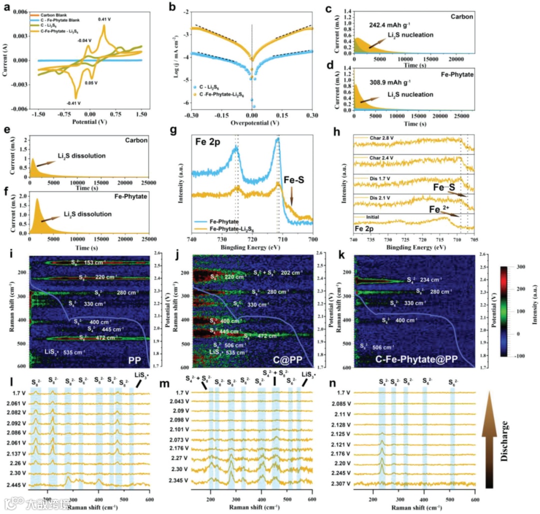 图2. 非晶相植酸铁表面多硫化锂转化的研究。(a)碳-Li2S6,碳-植酸铁-Li2S6组装的对称电池的CV测试。(b)碳-Li2S6,碳-植酸铁-Li2S6组装的对称电池的交换电流密度测试。(c,d)Li2S在碳和碳-植酸铁表面的成核测试。(e,f)Li2S在碳和碳-植酸铁表面的溶解测试。(g)非晶相植酸铁吸附Li2S6前后的XPS表征。(h)C-Fe-Phytate@PP隔膜在不同充放电状态下Fe 2p XPS表征。(i-n)PP, C@PP以及C-Fe-Phytate@PP隔膜的原位拉曼光谱表征。
