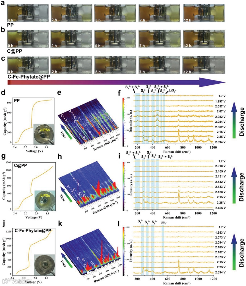 图5. (a-c)Li2S6溶液渗透实验测试。(g-I)PP电池,C@PP电池和C-Fe-Phytate@PP电池在隔膜/锂负极界面处的原位拉曼光谱。