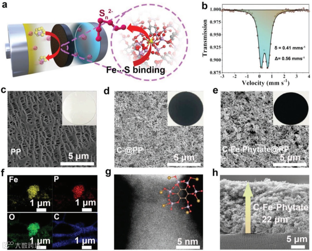 图1. 非晶相植酸铁以及植酸铁改性隔膜 (C-Fe-Phytate@PP)的表征。(a)非晶相植酸铁与多硫化锂作用示意图。(b)非晶相植酸铁的穆斯堡尔谱图。(c-e)PP, C@PP和C-Fe-Phytate@PP隔膜的SEM图以及光学照片。(f)非晶相植酸铁的EDS mapping 谱图。(g)非晶相植酸铁的HAADF-STEM图。(h)C-Fe-Phytate@PP隔膜的横截面结构。