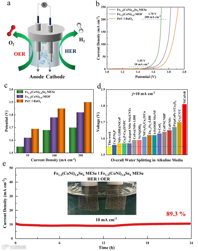 Fe1.2(CoNi)1.8Se6中熵金属硒化物作为阳极和阴极组装成一个双电极电解池,用于全解水。Fe1.2(CoNi)1.8Se6 电极在1.55 V电压下可以提供10 mA cm−2的电流密度,低于金属有机框架前驱体(1.62 V)和商用Pt/C | RuO2 (1.69 V)。此外,在模拟的工业条件下,最大电压仅需1.65 V的电压即可达到10 mA cm-2。在阳极和阴极上可以依次生成O2和H2。通过气相色谱法测量和计算得到了法拉第效率。收集的O2和H2的数量表明,在水电解过程中,法拉第效率接近100%(≈99.6%)。