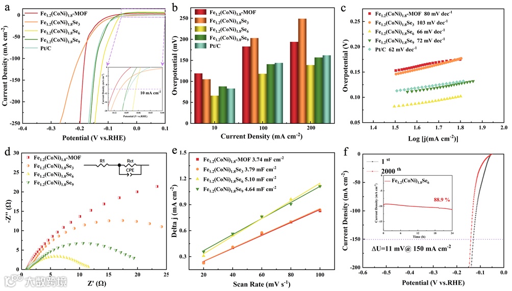 本研究通过硒化金属有机框架前驱体来制备了一系列Fe1.2(CoNi)1.8Sex中熵金属硒化物纳米颗粒。采用三电极体系在N2饱和1.0 M KOH电解液中评价了析氢/析氧性能。其中,性能最佳的Fe1.2(CoNi)1.8Se6 中熵金属硒化物纳米颗粒在碱性介质中表现出优异的电催化性能,在10 mA cm-2电流密度下析氢反应和析氧反应的过电位分别为66 mV和216 mV。并且,在24小时内保持着很好的稳定性。中熵系统的鸡尾酒效应有利于形成致密的钝化层,防止金属组分进一步氧化而保持稳定。此外,中熵结构的特性有助于降低吉布斯自由能,从而提高中熵体系的电催化性能。