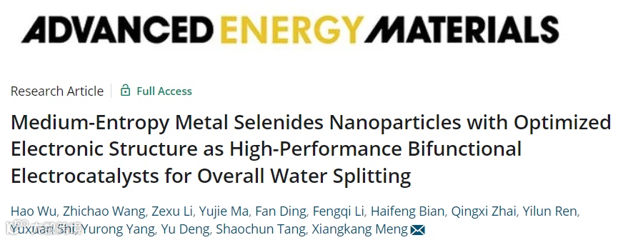 近日, 来自南京大学大学的孟祥康教授团队在国际知名期刊Advanced Energy Materials上发表题为“Medium-Entropy Metal Selenides Nanoparticles with Optimized Electronic Structure as High-Performance Bifunctional Electrocatalysts for Overall Water Splitting”的观点文章。该文通过硒化金属有机框架前驱体制备了一系列Fe1.2(CoNi)1.8Sx中熵金属硒化物纳米颗粒,展示了Fe1.2(CoNi)1.8Se6中熵金属硒化物在电催化中的应用,为促进HER/OER反应动力学提供了一种新的设计理念,有助于低成本的工业制氢。