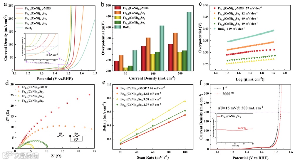 图2. 在1.0 M KOH下电催化剂的析氧性能。