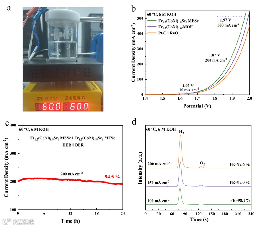 图5. 在模拟工业条件 (60 °C, 6.0 M KOH)下电催化剂的全解水性能。