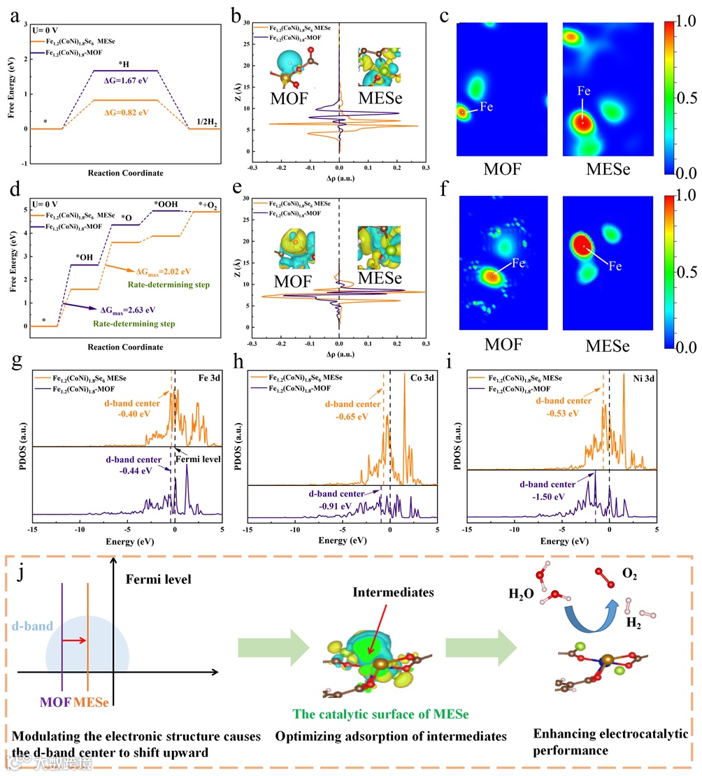 通过第一性原理计算, 我们从电子结构层面进一步研究了Fe1.2(CoNi)1.8Se6中熵金属硒化物对电催化性能的调控机理。吉布斯自由能图说明中熵金属硒化物形成后, 有利于样品对*H和*OH的吸附/解吸,提高催化活性。电荷密度差图显示了模型中中间体和活性位点之间的电子积累和耗尽情况。研究发现,相对于前驱体,在中熵金属硒化物表面有更多的电子转移,有利于键的激活。得到的二维平面电荷密度差Δρ,进一步直观地研究电荷转移。与前驱体相比,中熵金属硒化物的电荷密度差异更大,说明更多的电子分布在吸附中间体周围,从而增强了催化活性。此外,电子局域化函数显示Fe1.2(CoNi)1.8Se6中熵金属硒化物对* H和*OH的电子局域化程度更高,导致在电催化过程中与中间体的结合能更强。