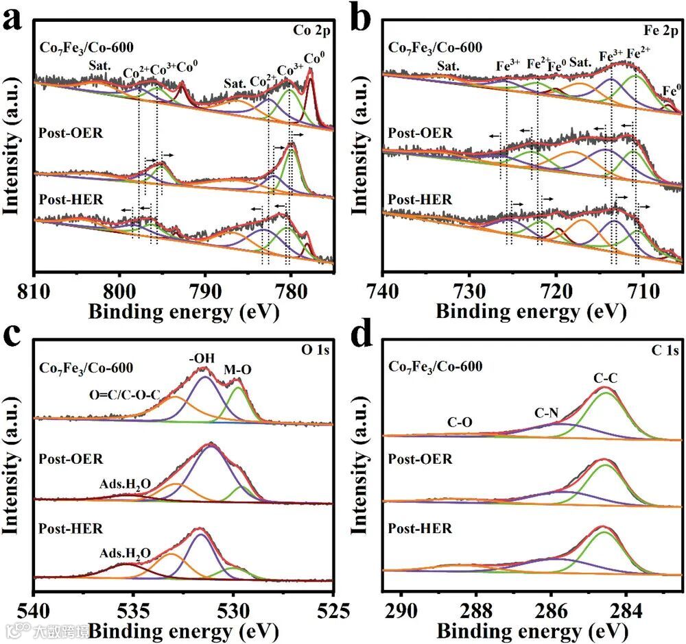 图3. 在OER/HER稳定性测试之前和之后,Co7Fe3/Co-600的高分辨率XPS光谱(a)Co 2p, b)Fe 2p, c)O 1s, 和 d)C 1s。