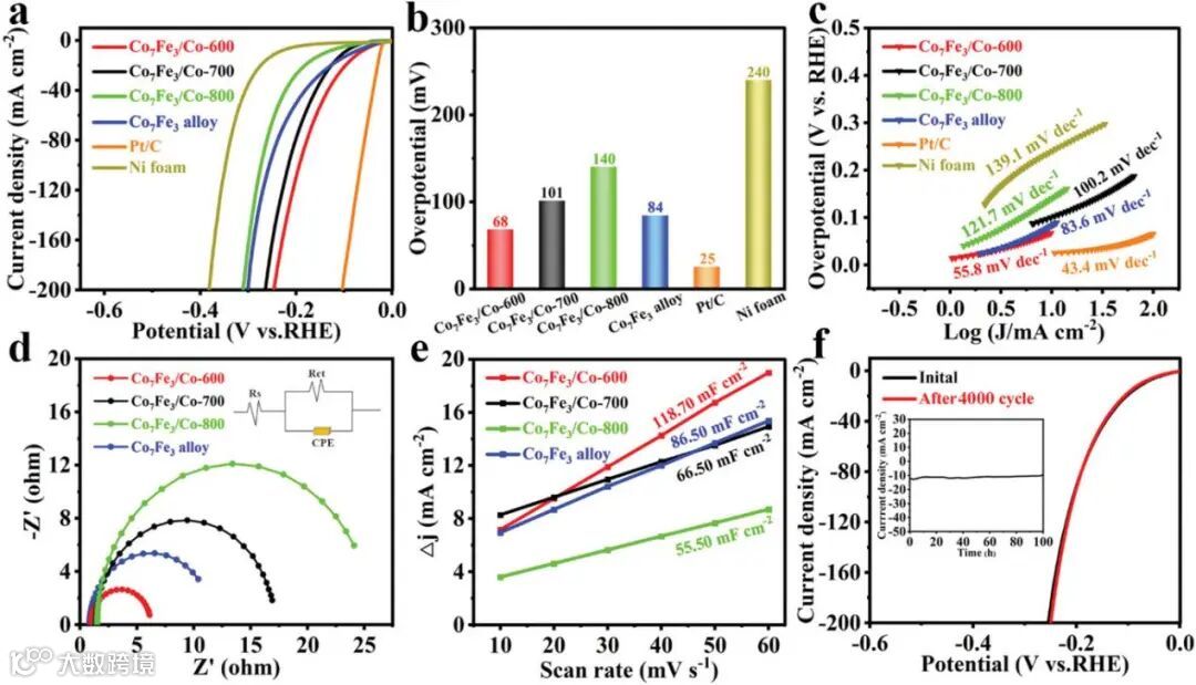 图5. a) LSV曲线;b) 10 mA cm-2时的过电位;c) Tafel斜率和d) 纯相Co7Fe3合金、Co7Fe3/Co-600、Co7Fe3/Co-700、Co7Fe3/Co-800、泡沫镍和Pt/C的EIS图(d中的插图是等效电路);e) 不同催化剂的Cdl值;f) Co7Fe3/Co-600在4000次CV循环前后的极化曲线。插图:Co7Fe3/Co-600 100小时的电流时间(i-t)曲线。