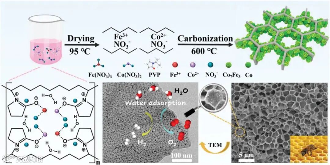 方案1显示了嵌入Co7Fe3/Co纳米颗粒的合成路线。首先,钴(II)和铁(III)通过静电稳定作用和金属离子与吡咯烷环上的酰胺基团之间的配位而结合。随后,PVP稳定剂脱水并产生较短的聚合物链,当它们吸附在金属离子表面时,聚合物链被封住。同时,金属离子在网络中分布良好。
