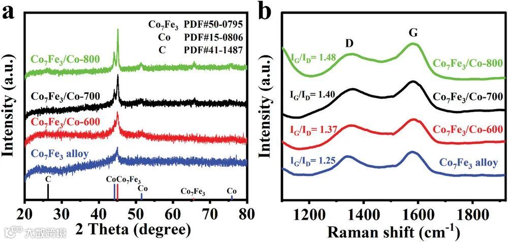 图1. a) 纯相Co7Fe3合金、Co7Fe3/Co-600、Co7Fe3/Co-700和Co7Fe3/Co-800的XRD谱图和b)拉曼光谱。