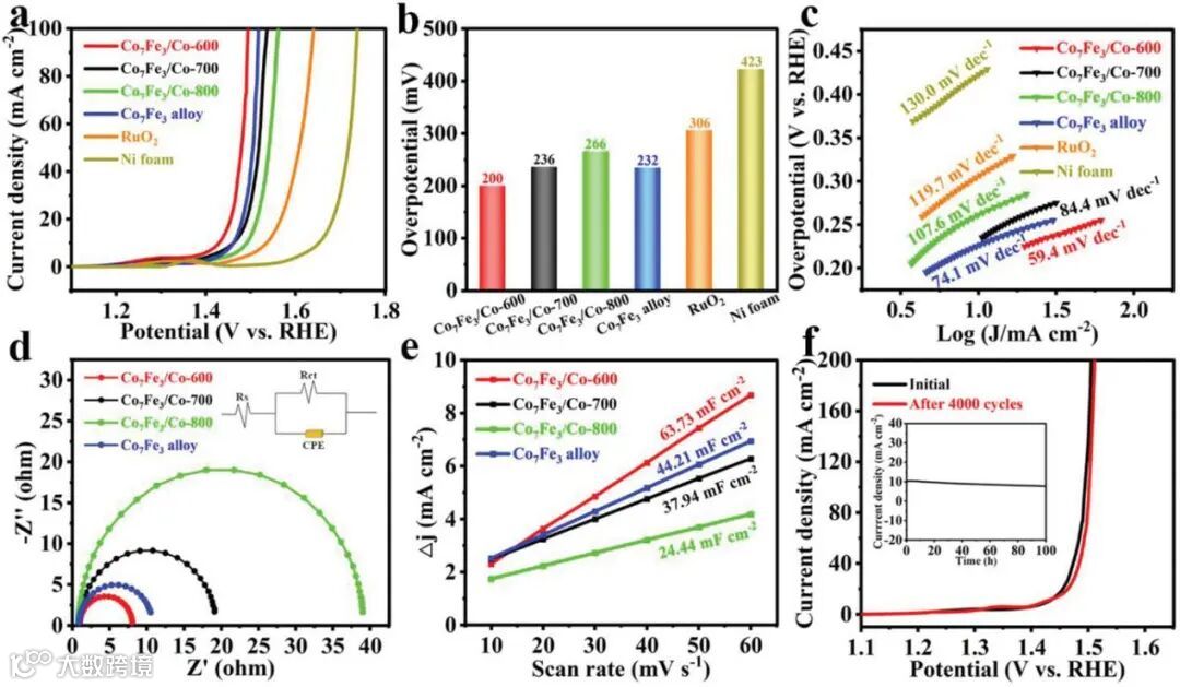 图4. a) LSV曲线;b) 10 mA cm-2时的过电位;c) 纯相Co7Fe3合金、Co7Fe3/Co-600、Co7Fe3/Co-700、Co7Fe3/Co-800、Ni泡沫和RuO2的Tafel斜坡;d) Co7Fe3合金、Co7Fe3/Co-600、Co7Fe3/Co-700和Co7Fe3/Co-800的EIS图。(d)中的插图是等效电路;e) 不同样品的双层容量(Cdl)值;f) Co7Fe3/Co-600在4000次CV循环前后的LSV曲线。插图:Co7Fe3/Co-600在100小时内的电流时间(i-t)曲线。
