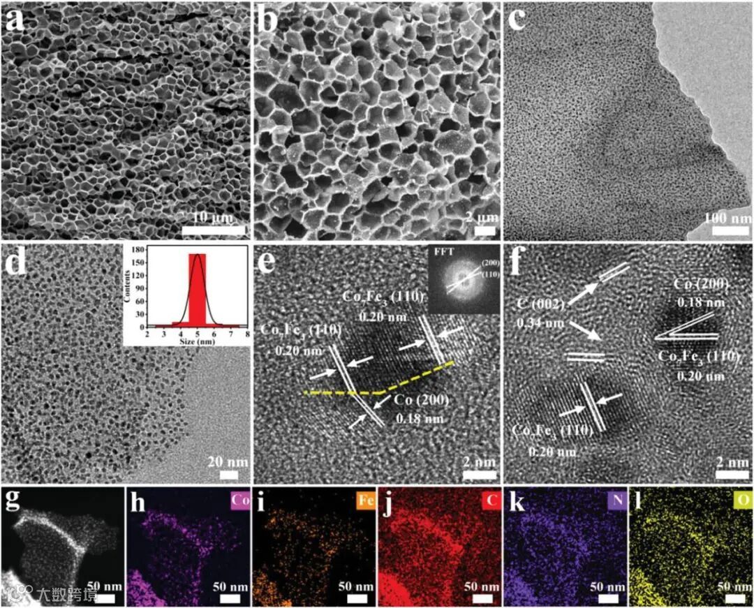 图2. a, b)Co7Fe3/Co-600的SEM和c, d)TEM图像显示Co7Fe3和Co在三维蜂窝状结构中的均匀分布;e, f)Co7Fe3/Co-600的HRTEM图像和快速傅里叶变换图像(插图);g-l)暗场扫描透射选举显微镜和相应元素映射分布。