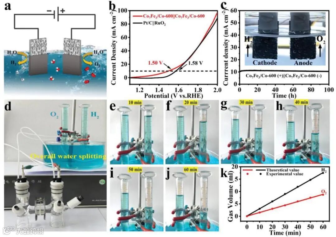 图7. a) 整体水分解的示意图;b) 双电极系统在1.0 M KOH中整体水分离的LSV曲线;c) Co7Fe3/Co-600在1. 0 M KOH中100小时的i-t曲线(插图显示了从电极产生的H2和O2的气泡);d)用于收集产生的H2和O2的排水装置;e-j)在总共60分钟内每隔10分钟产生的测量气体量的放大数字图像;k)HH22和O2的数量与时间的关系。