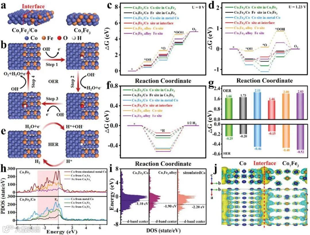 图6. a) Co7Fe3/Co和纯相Co7Fe3的理论模型;b) 氧中间产物(*OH、*O和*OOH)在界面上的优化吸附构型;Co7Fe3/Co和Co7Fe3上OER的自由能图 c) 在零电位(U = 0)和d) 平衡电位(U = 1. 23 V);e)*H吸附在Co7Fe3/Co上的理论模型;f)HER在Co7Fe3/Co和Co7Fe3上的自由能图;g)计算的*OOH和*H在Co7Fe3/Co和Co7Fe3上的吸附能;h) 表面模型的部分状态密度(PDOS)(费米能级水平用虚线表示);i) d-带中心;j) 界面上的差分电荷密度(黄色和蓝色分别代表电荷的积累和耗尽)。