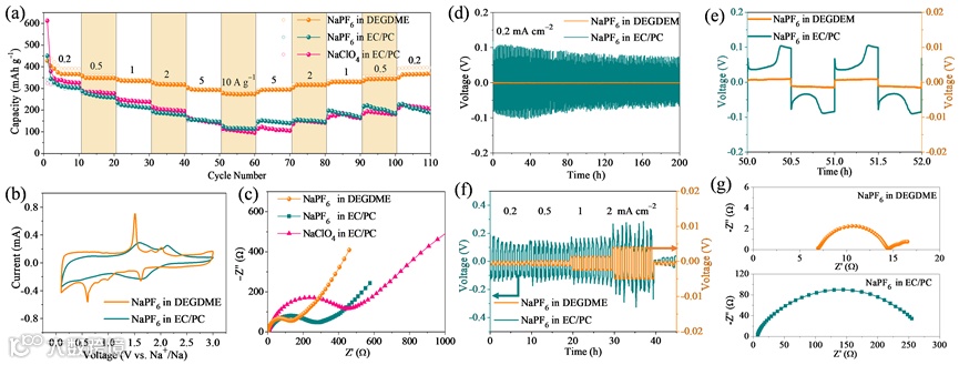 图4. (a-c) VSe2/CNT负极在不同电解液中的电化学性能: (a) 0.2-10 A g-1电流下的倍率性能图,(b) 0.4 mV s-1下的CV曲线,(c) 第一圈循环后的Nyquist图。(d-g) 含有不同电解液的Na||Na对称电池的电化学性能: (d)在0.2 mA cm-2下的恒流循环性能图,(e) 循环50小时后放大曲线图,(f)在不同电流密度下的循环性能图,(g) Nyquist图。