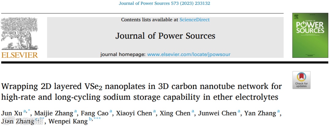 近日,合肥工业大学许俊教授课题组与中国石油大学(华东)康文裴副教授和温州大学张鉴教授的团队合作,在国际知名期刊Journal of Power Sources上发表题为“Wrapping 2D layered VSe2 nanoplates in 3D carbon nanotube network for high-rate and long-cycling sodium storage capability in ether electrolytes”的研究工作。