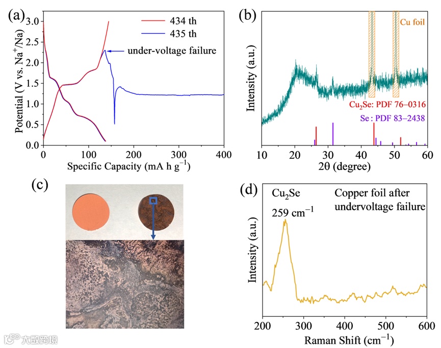 图3.(a) VSe2负极发生 “欠压失效”的充放电曲线图;(b)VSe2负极在“欠压失效”后放电至0.1 V的XRD图;(c) VSe2电池在“欠压失效”后的铜集流体(右)与原始铜集流体(左)的对比照片,(d) “欠压失效”后铜集流体表面黑色产物的拉曼光谱。