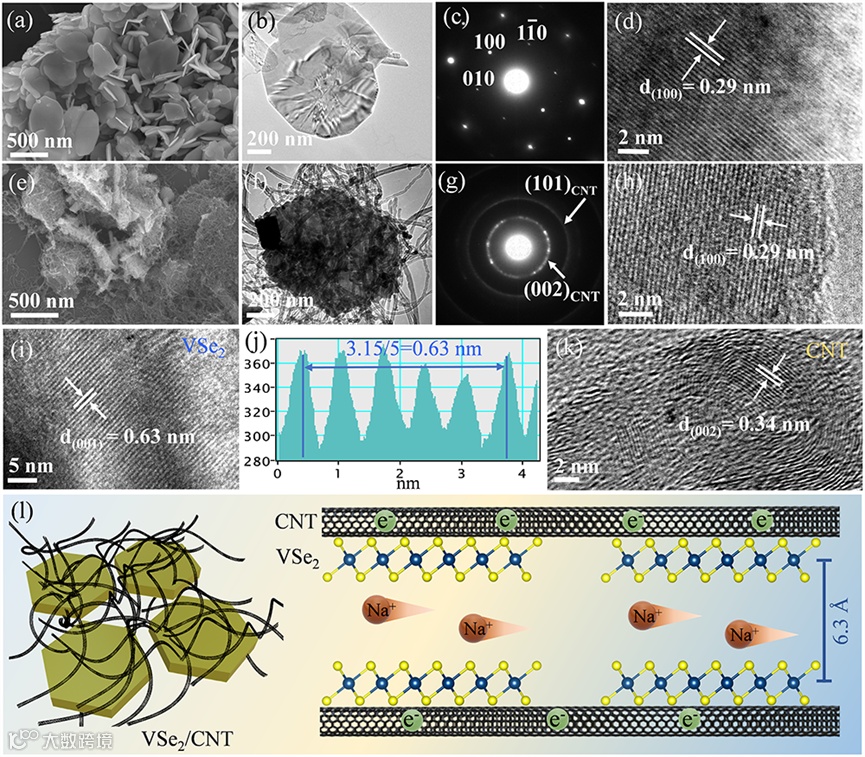 图1. (a-d) 纯VSe2纳米片的表征:(a) SEM图,(b) TEM图,(c) SAED图和(d) HRTEM图;(e-k) VSe2/CNT结构的表征:(e) SEM图,(f) TEM图,(g) SAED图,(h,i) HRTEM图,(j) 晶格间距测量。(k) CNT的HRTEM图,(l) VSe2/CNT结构及促进电子和钠离子快速传输的模型示意图。