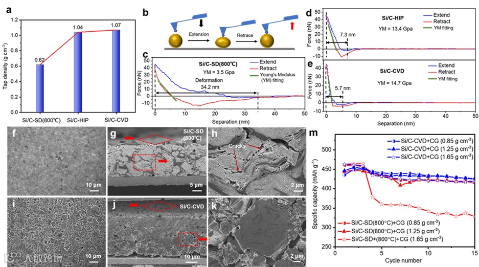 纳米硅的膨胀可以分为两个部分。一部分是锂离子嵌入硅中形成锂硅合金时的膨胀。在Si转化为Li15Si4的过程中,材料的杨氏模量从~90 MPa下降到~12 MPa。这需要非常大的压缩压力来抑制,硅碳结构的强度很难达到。而且,如果抑制这种膨胀,它将形成Li11Si4而不是Li15Si4,这将导致有限的锂化和容量下降。另一部分是由于纳米si在重复相变过程中形成大量缺陷而导致的不可逆膨胀。这些缺陷会随机增加,并向纳米si的中心聚集(图1b),导致体积不断增加到700%,从而有破裂的风险。高的结构强度可以有效抵抗Si分散不均匀引起的内应力分布不均匀和团聚纳米Si的电化学烧结现象。在反复充放电的相变过程中,相邻的Si颗粒的原子会聚集在一起形成新的Si-Si键,导致微米级Si的形成和局部体积变化的增加,这更容易导致复合颗粒破裂。