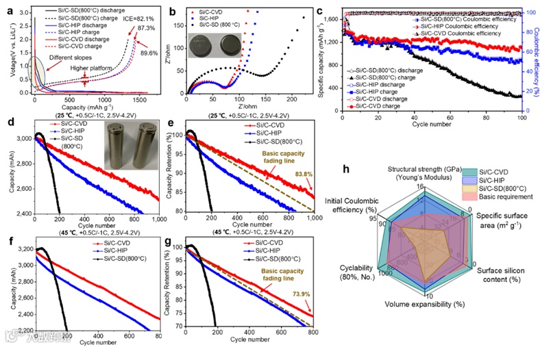 圆柱电池具有最大的刚度来限制膨胀,是目前硅/碳复合材料最容易实现的应用场景。本论文采用圆柱电池18650进行性能评价,设计容量为3050 mAh(见实验)。正极材料为LiNi0.8Co0.1Mn0.1O2 (NCM811);阳极材料(420 mAh g-1)是Si/C和石墨的混合物。在25℃下循环1000次后,容量保持率高达83.8%。在45℃下循环800次后,容量保持率仍然达到73.9%。本工作中采用的Si/C复合材料的加工方法在工业中相对成熟,并且还按照商用圆柱形电池的要求进行了全电池性能测试,为Si/C复合材料的应用提供了极好的参考。