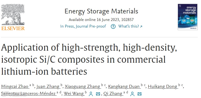 近日,来自西班牙巴斯克国家纳米中心的Qi Zhang教授与南京航空航天大学的汪炜教授合作,在国际知名期刊Energy Storage Materials发表题为“Application of high-strength, high-density, isotropic Si/C composites in commercial lithium-ion batteries”的观点文章。该研究文章强调了硅碳材料结构强度在商业应用中的重要性,并制备出了一款高强度、高密度、各向同性的硅碳复合材料,具有优异的电化学性能。