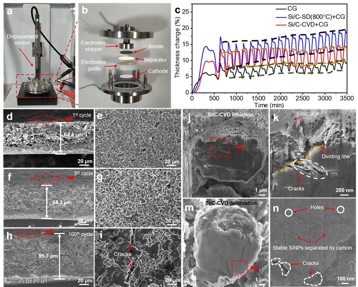 Si可以与Li形成合金,达到极高的理论比容量,因此被认为是最有潜力的下一代负极材料之一。然而,在嵌/脱锂的过程中,Si的体积发生变化巨大(~300%),并伴随一系列的副反应,如SEI膜的不断破裂和重建、电解液的过度消耗、气体的大量产生、电极的损坏等,严重制约了Si基阳极材料的发展和应用。虽然纳米结构的Si可以克服锂化过程中巨大的体积膨胀而不破裂,但在实际应用中,作为负极的是Si/C复合材料,其中Si的体积膨胀很容易传递到Si/C,导致复合材料破裂,从而引起电接触损失和循环变差。到目前为止,报道的Si/C复合材料中很少有关于满足实际应用要求的结构强度的研究。Si/C的高结构强度是应用的先决条件,虽然其不能抑制Si变为Li15Si4时的膨胀,但可以抑制Si自身的不可逆膨胀。
