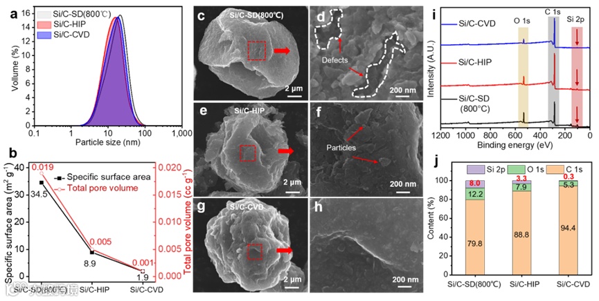 通过N2吸附对硅碳复合材料的比表面积(黑色曲线)和总孔隙体积(红色曲线)进行评价,可以得到在最后的CVD炭沉积过程,有效修饰了颗粒表面缺陷,颗粒表面光滑, SSA和孔体积分别下降到1.9 m2 g-1和0.001 cc g-1,接近石墨。表面硅含量是表征表面特性的另一个重要指标,但很容易被忽视。表面硅含量越高,说明裸露的硅材料越多,这些硅会直接与电解液接触生成更多的SEI膜,所以表面包覆的质量非常重要。本文制备的硅碳复合材料表面的硅含量仅有0.3%,几乎避免了Si与电解液的直接接触。