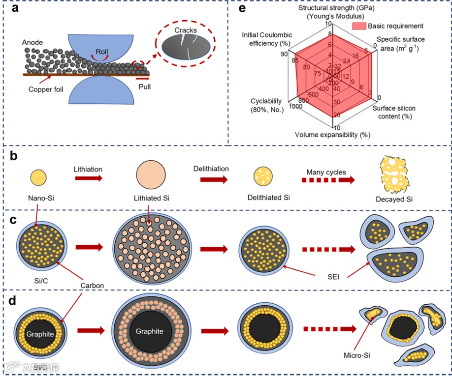 图1. 在实际应用中,Si/C颗粒发生破裂的几个主要的原因,以及需要重点关注的几个指标。