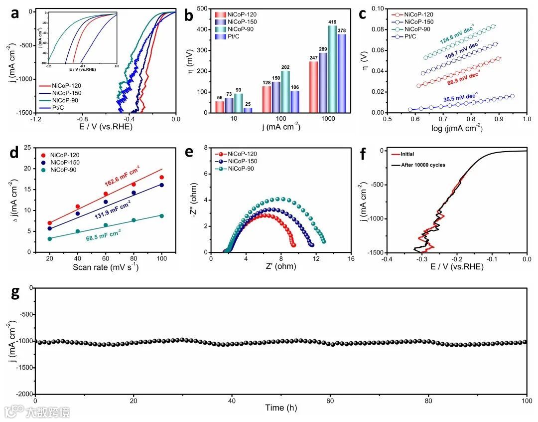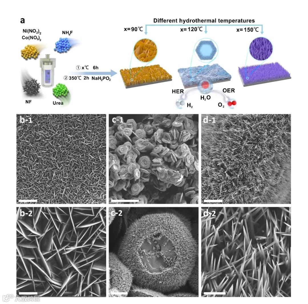 要点二:通过水热磷化策略实现对NiCoP微观结构的进一步动态调控,在120℃水热温度下获得的NiCoP-120呈现出独特的多尺度层次结构,集3D-泡沫镍基板、2D-纳米片和1D-纳米针于一体(图2)。