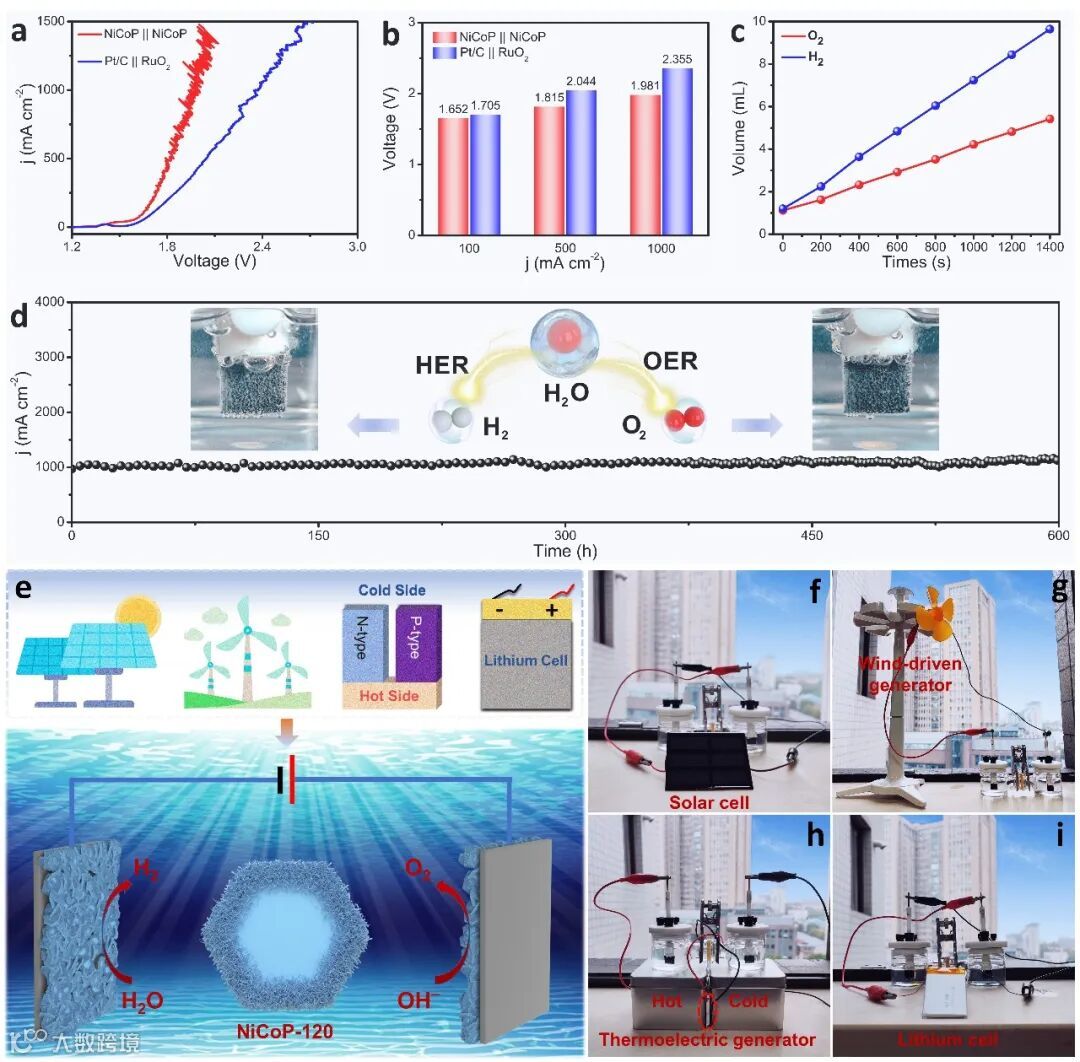 要点四:NiCoP作为双功能催化剂展现的优异大电流全水解性能(1.981V@1A cm-2,稳定运行达600h)以及太阳能、风能、热能、锂电池等绿色能源制氢系统的成功示范,进一步为电解水技术的大规模实际应用提供了更多应用场景(图4)。