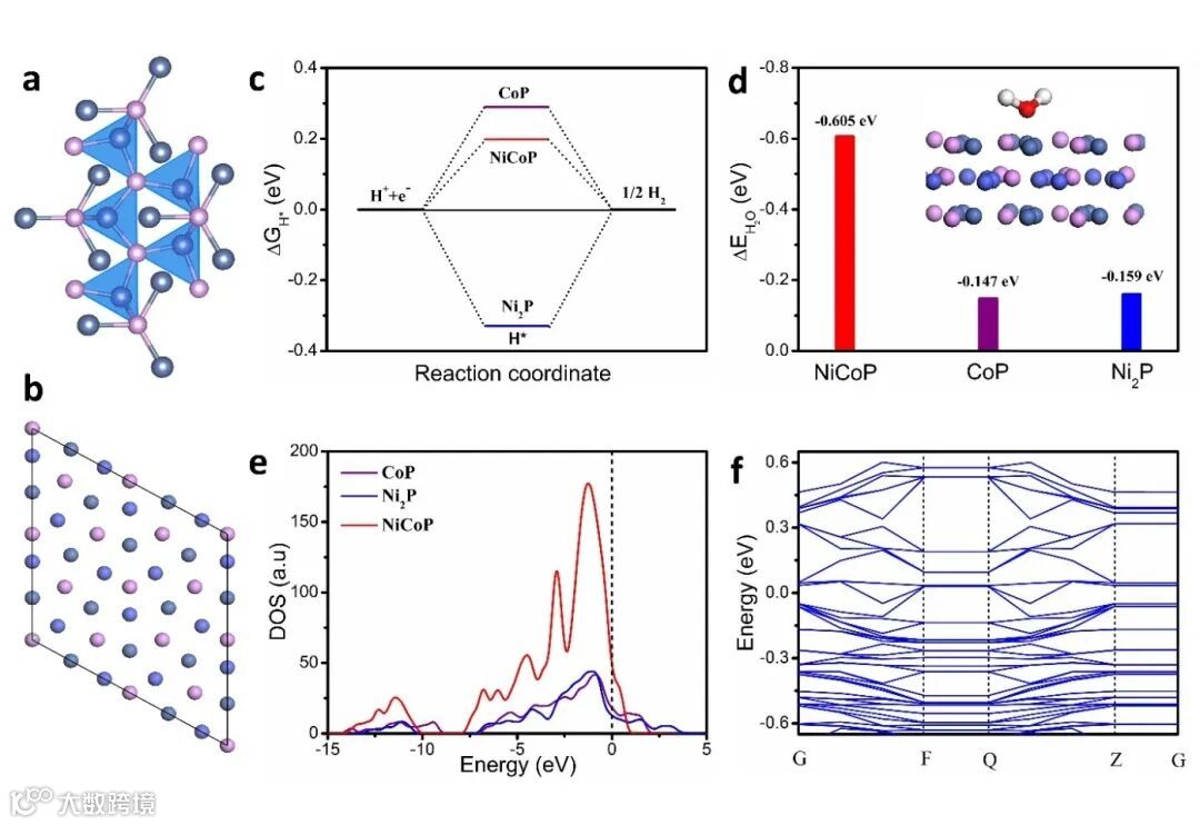 要点一:DFT理论计算(图1)表明,双金属磷化物NiCoP具有优化的ΔGH*、良好的H2O吸附和合适的电子/能带结构,有望成为有效的HER催化剂。