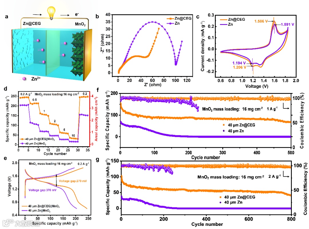 图6. 在2 M ZnSO4+0.2 M MnSO4电解液中的全电池性能评估。a) Zn@CEG||MnO2全电池示意图。b) EIS谱线。c) CV曲线,扫速为0.2 mV s-1。d) 倍率性能。e) 在0.2 A g-1下的充放电曲线。在f) 1 A g-1和g) 2 A g-1下的长循环性能。