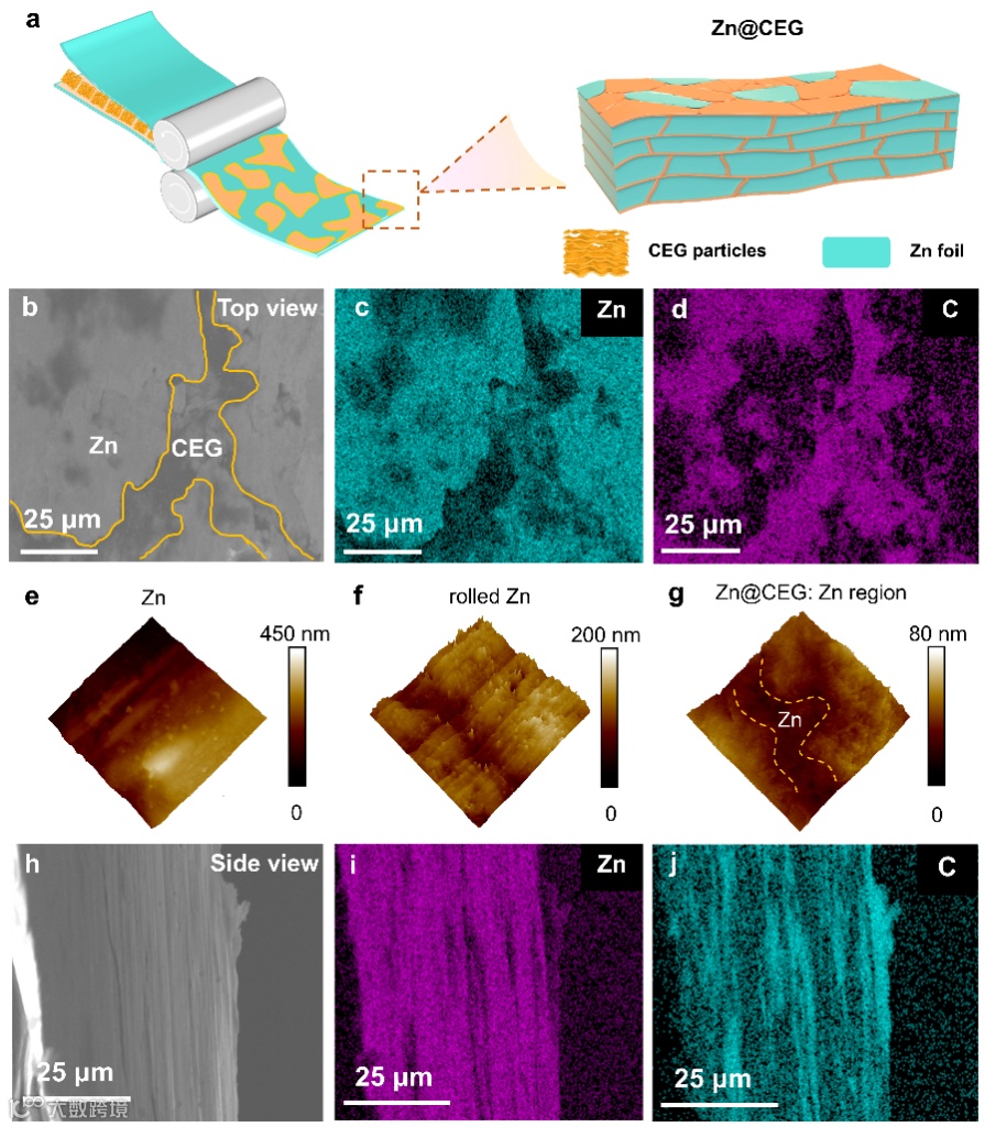 图1. a) 室温辊压法制备Zn@CEG复合箔材的示意图。b-d) Zn@CEG的表面SEM图像及相应的元素分布。e) 原始锌箔、f) 辊压后锌箔和g) 复合阳极中锌区域的AFM 3D高度图像(扫描面积为5 × 5 μm)。h-j) Zn@CEG的截面SEM图像及相应的元素分布。