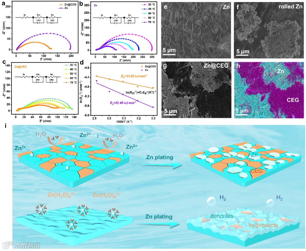 图4. a) Zn@CEG和Zn对称电池的EIS结果。b-c) 不同温度下的EIS结果和阿伦尼乌斯曲线比较。在0.5 mA cm−2条件下沉积1 mAh cm−2后e) 原始锌箔、f) 辊压后锌箔和g-h) 复合阳极的表面SEM图像。i) Zn@CEG和Zn阳极在锌沉积过程中的机理比较。