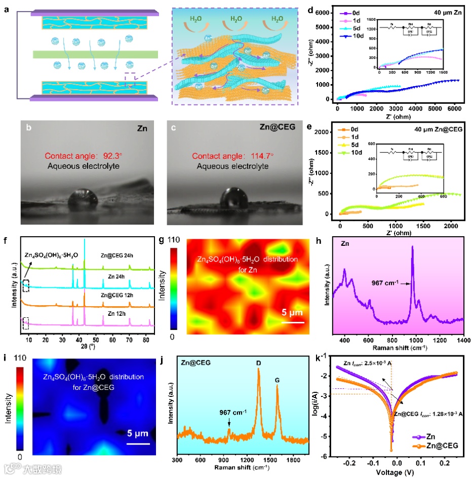 图2. a) Zn@CEG对称电池中电极的防腐蚀机理阐述。b) Zn和c) Zn@CEG对2 M ZnSO4电解液的接触角测试。d) Zn和e) Zn@CEG对称电池的时间依赖性EIS结果。f) Zn和Zn@CEG浸泡12或24 h后的XRD图谱。g) Zn和i) Zn@CEG在2 M ZnSO4电解液中浸泡24 h后的表面Zn4SO4(OH)6·5H2O分布及相应的拉曼谱图h) 和j)。k) 在2 M ZnSO4电解液中的线性极化曲线。