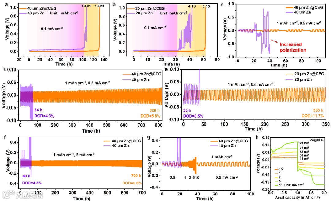 图3. a-b) 超薄Zn和Zn@CEG电极 (40 μm和20 μm) 充电至1 V (相对于 Zn/Zn2+) 时的全部锌剥离曲线。c) 动态测量,先在0.5 mA cm−2, 1 mAh cm−2条件下进行5次锌的剥离/沉积,再静置10 h。d-f) 不同厚度的超薄电极在1 mAh cm−2, 5 mA cm−2和1 mAh cm−2, 0.5 mA ccm−2条件下的循环性能。g) 对称电池在放电容量为1 mAh cm-2,不同电流密度 (0.5-10 mA cm−2) 下的倍率性能和h) Zn@CEG对称电池相应的详细图谱。