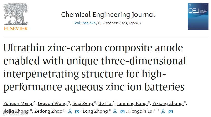 其成果以题为“Ultrathin zinc-carbon composite anode enabled with unique three-dimensional interpenetrating structure for high-performance aqueous zinc ion batteries”在国际知名期刊Chemical Engineering Journal上发表。复旦大学2021级硕士研究生孟宇寰为本文第一作者。通讯作者为卢红斌教授、张隆副教授以及赵则栋博士(现任职于小米汽车),通讯单位为复旦大学高分子科学系。