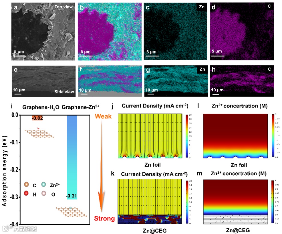 图5. 在0.5 mA cm−2, 1 mAh cm−2条件下循环5圈后Zn@CEG电极的a-d) 表面和e-h) 截面SEM图像及相应的元素分布。i) 密度泛函理论 (DFT) 模拟Zn2+和H2O在原始石墨烯上的吸附。Zn箔和Zn@CEG的j-k) 电流密度和l-m) Zn2+浓度模拟。