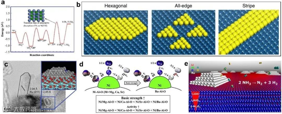 钌(Ru)基催化剂是目前活性最佳的氨裂解催化剂,然而由于钌的价格昂贵,其他非贵金属催化剂如镍(Ni)、铁(Fe)和碳基材料也得到了广泛的研究。目前,氨裂解催化剂通常由金属和载体组成,其中一些还含有助剂。金属主要是纳米分散的过渡金属颗粒或团簇,载体是氧化物,如氧化镁(MgO)、氧化铝(Al2O3)、二氧化铈(CeO2)、碳纳米管(CNTs)等,助剂多为碱金属盐,如氯化钾(KCl)和硝酸钠(NaNO3)等。催化剂的活性受多种因素的影响,包括晶体取向、配位数、粒径和载体材料等。