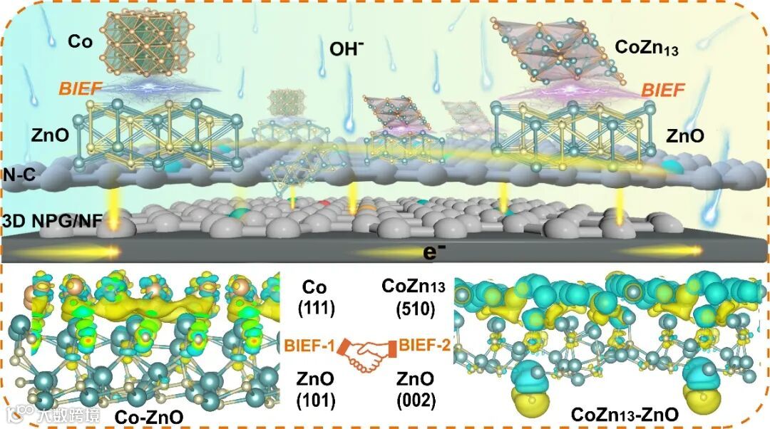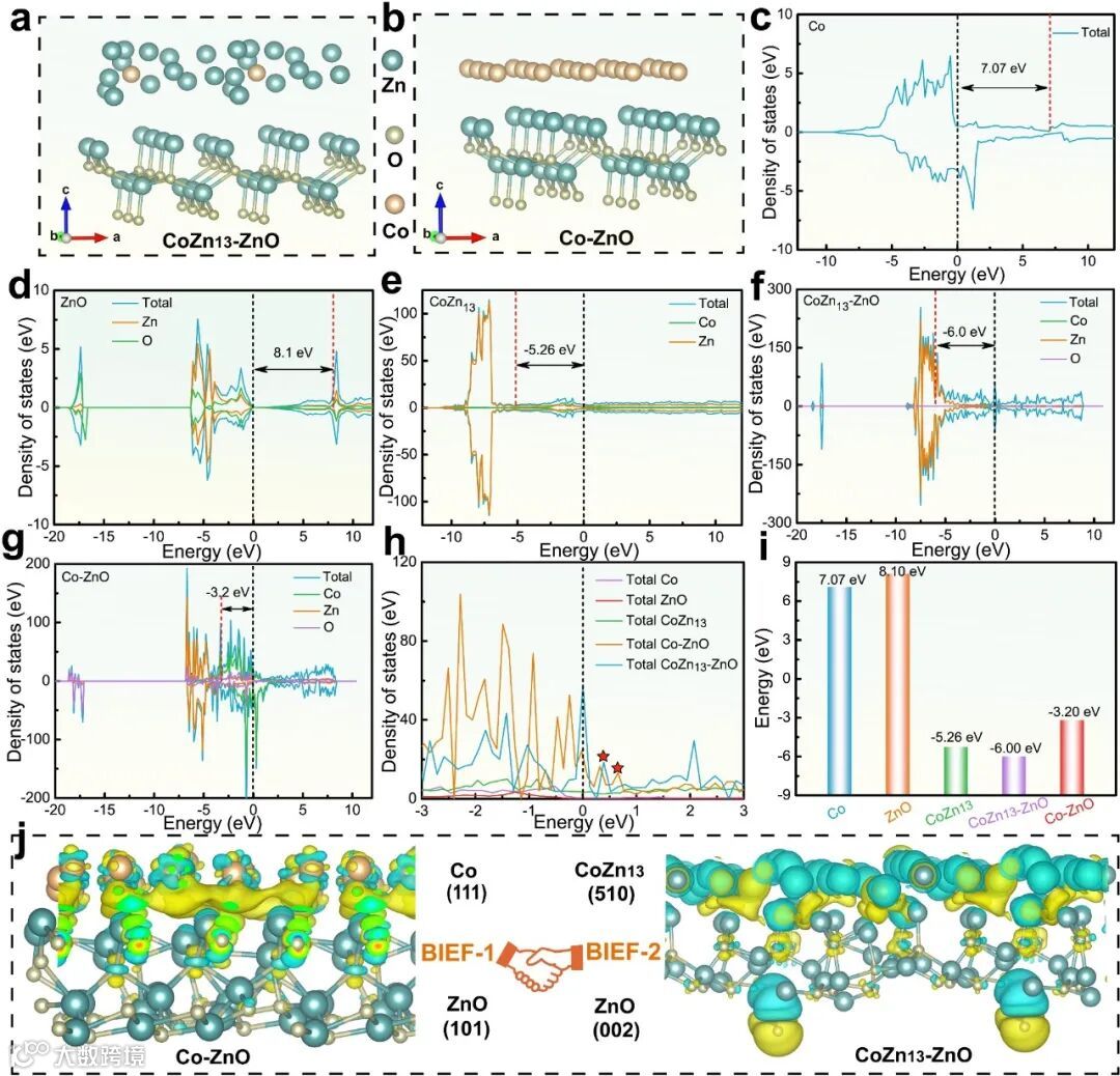 (a) CoZn13-ZnO和(b) Co-ZnO异质结构晶体图;计算的TDOS和上下PDOS:(c) Co,(d) ZnO,(e) CoZn13,(f) CoZn13-ZnO,(g) Co-ZnO;(h)以上不同材料的上旋总DOS和(i) d能带中心能值;(j) Co-ZnO和CoZn13-ZnO异质结的差分电荷密度图,其中黄色和浅蓝色区域分别代表电子密度的积累和消耗。