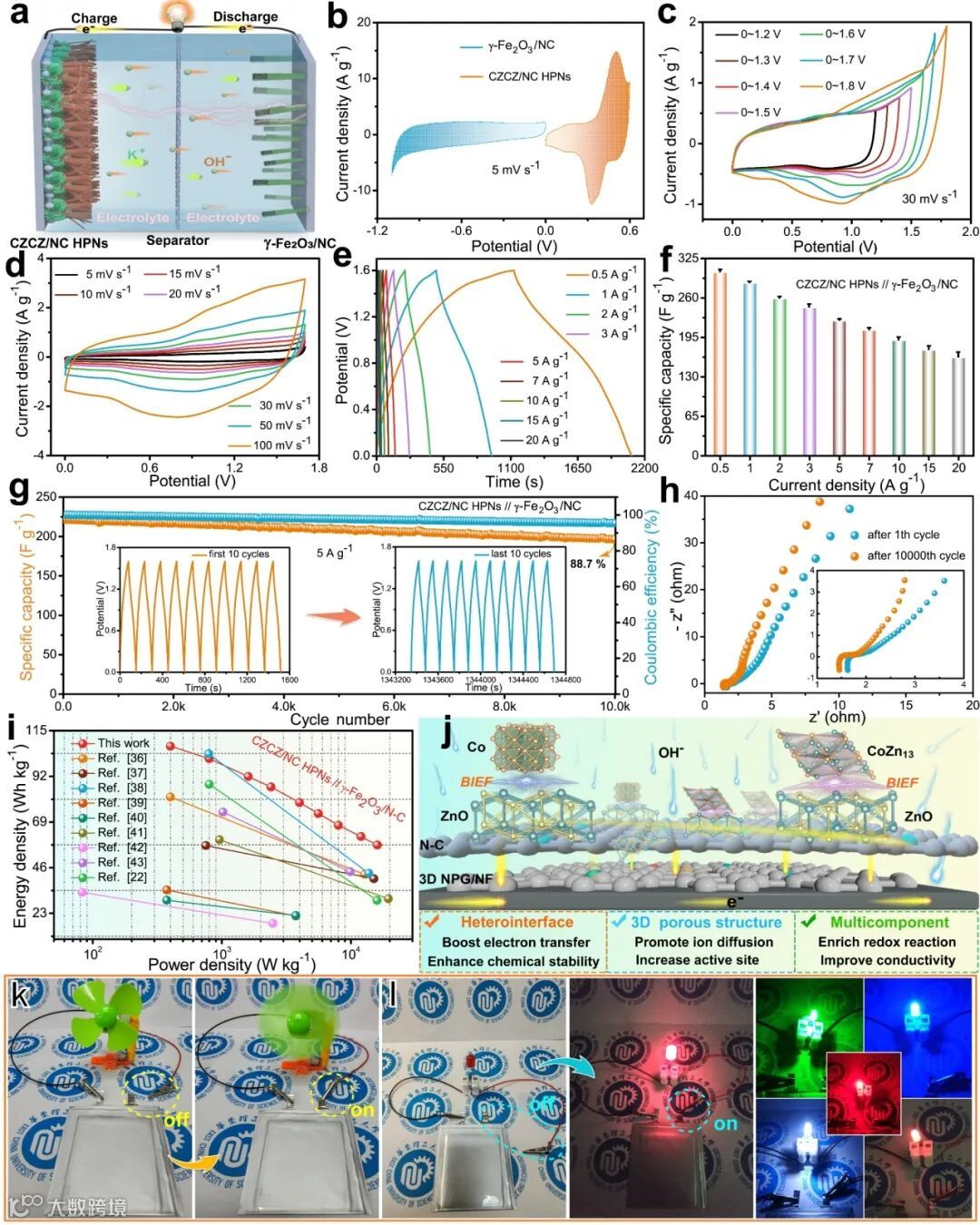 (a)组装后的CZCZ/NC HPNs//γ-Fe2O3/NC HSC结构示意图,(b)不同工作电压下HSC器件的CV曲线,(c) 5 mV s−1下CZCZ/NC HPNs和γ-Fe2O3/NC电极的CV曲线,(d)不同扫描速率下HSC的CV曲线,(e)不同电流密度下HSC的GCD曲线,(f) 不同电流密度下HSC的比电容比较,(g)在5 A g−1下,超过10000次循环的电容保持率和库仑效率,(h) HSC的EIS图,(i) 该HSC和其他先前报道HSC的Ragone图;(j) CZCZ/NC HPNs电极异质界面内置电场示意图;(k, l)制备的软包袋式HSC点亮各种颜色的led灯图。