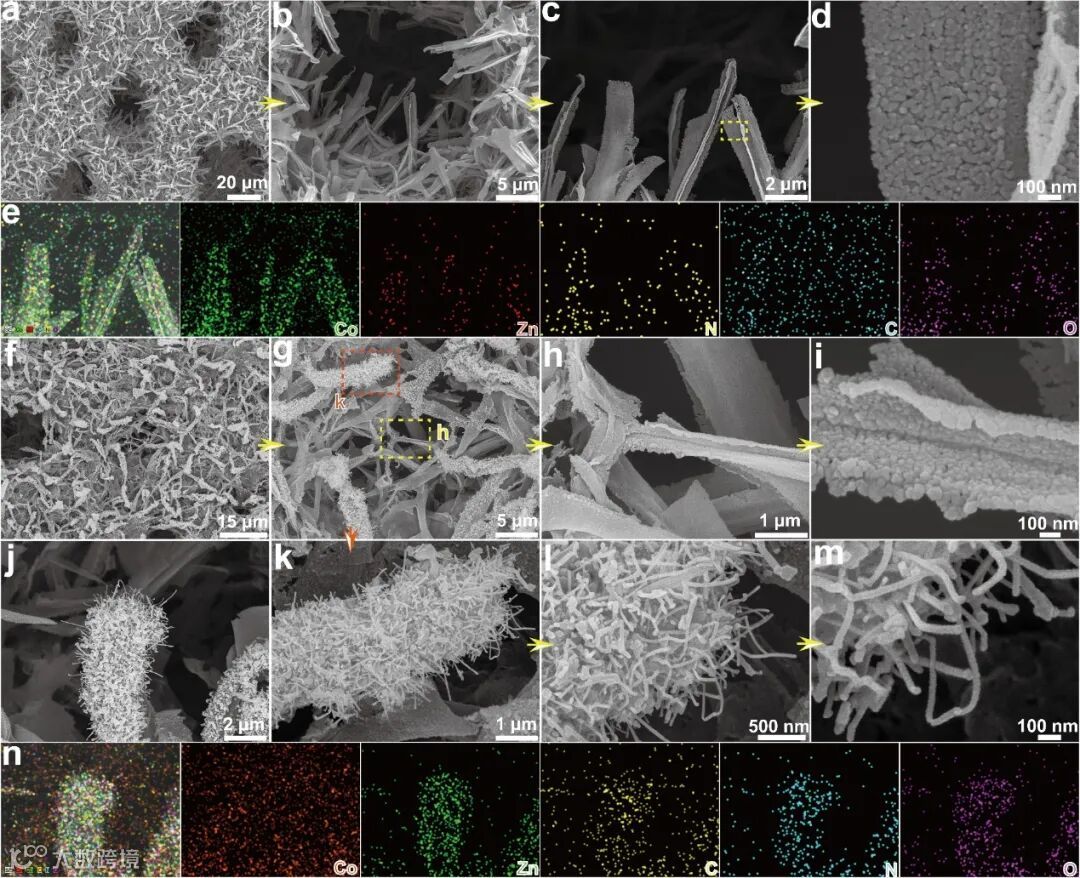 (a-d) CCZZ/NC PNBAs,(f-m) CZCZ/NC HPNs的FE-SEM图像; (e) CCZZ/NC PNBAs和(n) CZCZ/NC HPNs的能谱图,展示了Co、Zn、N、C和O元素的分布。