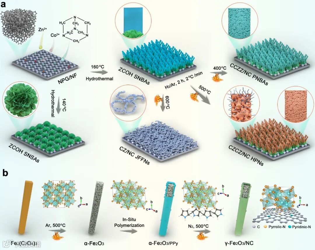 (a) CCZZ/NC PNBAs、CZCZ/NC HPNs、CZ/NC JFFNs和(b) γ-Fe2O3/NC的制备过程示意图